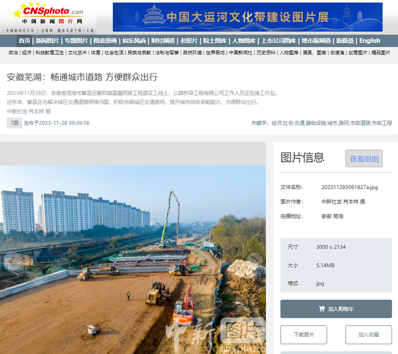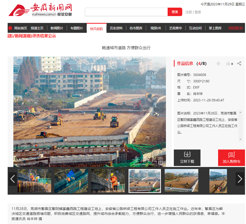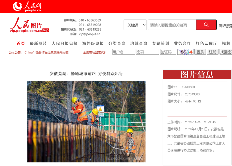 11月28日,中國新聞圖片網(wǎng)、人民網(wǎng)、安徽新聞網(wǎng)等多家央媒和省級媒體關(guān)注公司承建的繁昌區(qū)富鑫西路項(xiàng)目工程建設(shè),以圖組形式聚焦項(xiàng)目橋梁混凝土澆筑和路基施工。