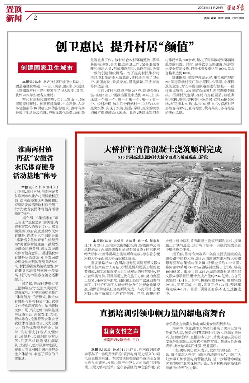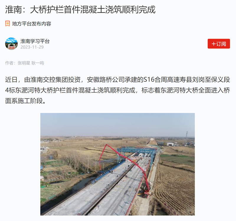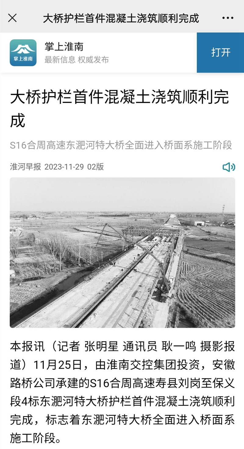 【名媒聚焦】學(xué)習(xí)強國、淮河早報、掌上淮南:S16合周高速東淝河特大橋全面進入橋面系施工階段