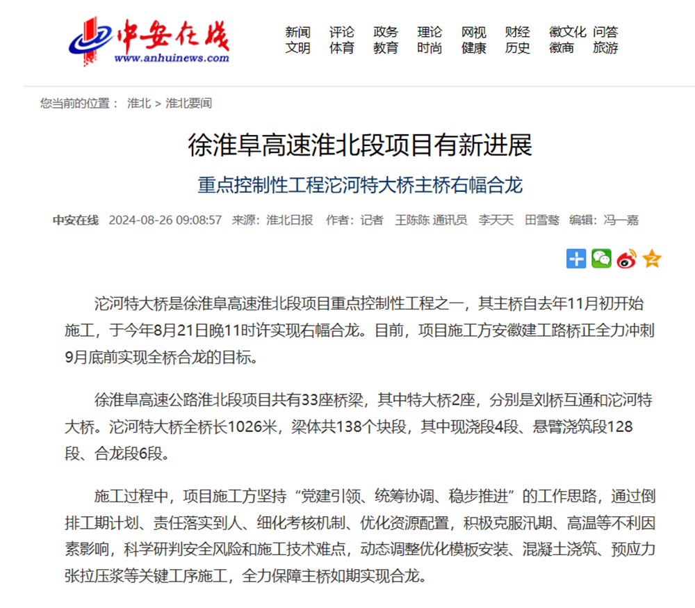 【名媒聚焦】中安在線、淮北電視臺、淮北日報等主流媒體聚焦徐淮阜高速淮北段項目沱河特大橋主橋右幅合龍