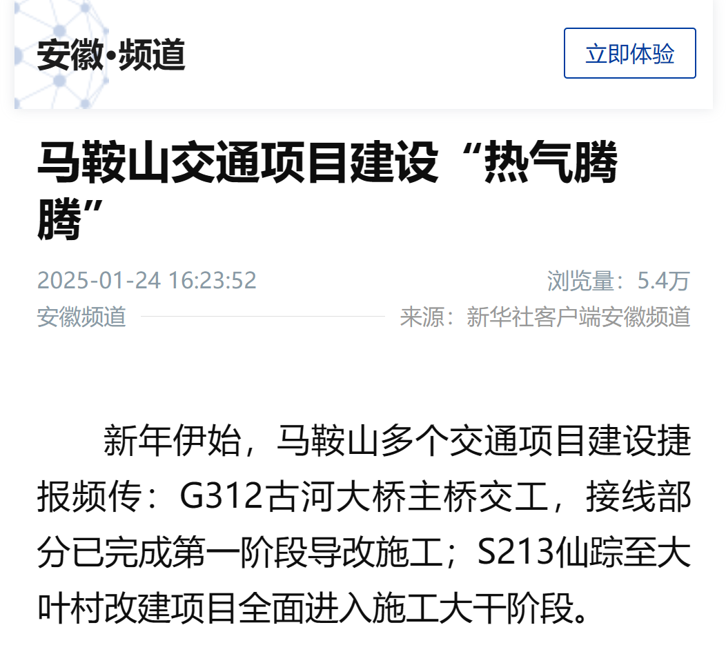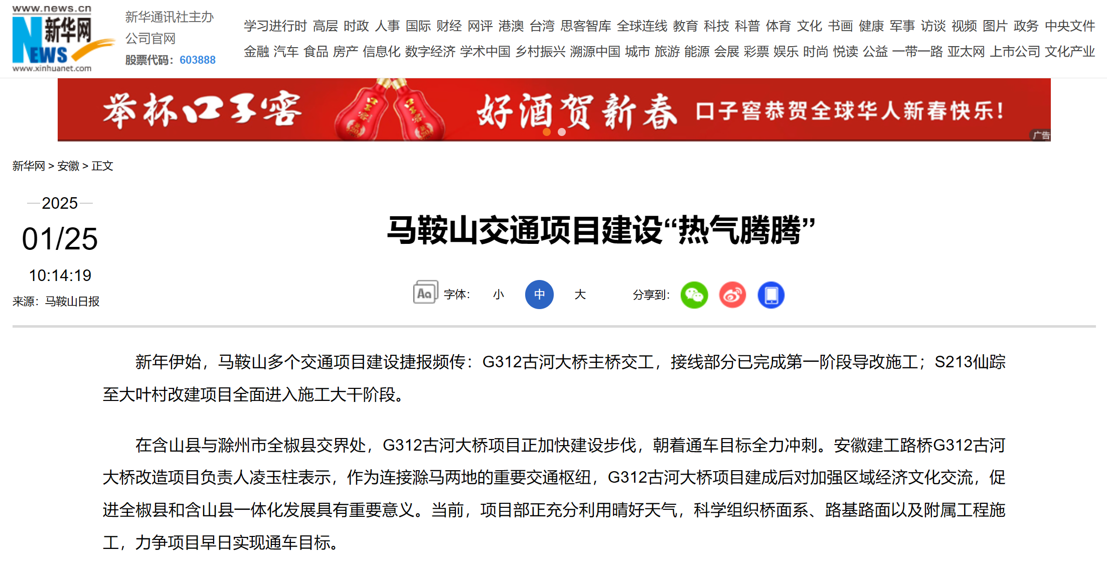 新年伊始,馬鞍山多個(gè)交通項(xiàng)目建設(shè)捷報(bào)頻傳:G312古河大橋主橋交工,接線(xiàn)部分已完成第一階段導(dǎo)改施工;S213仙蹤至大葉村改建項(xiàng)目全面進(jìn)入施工大干階段。