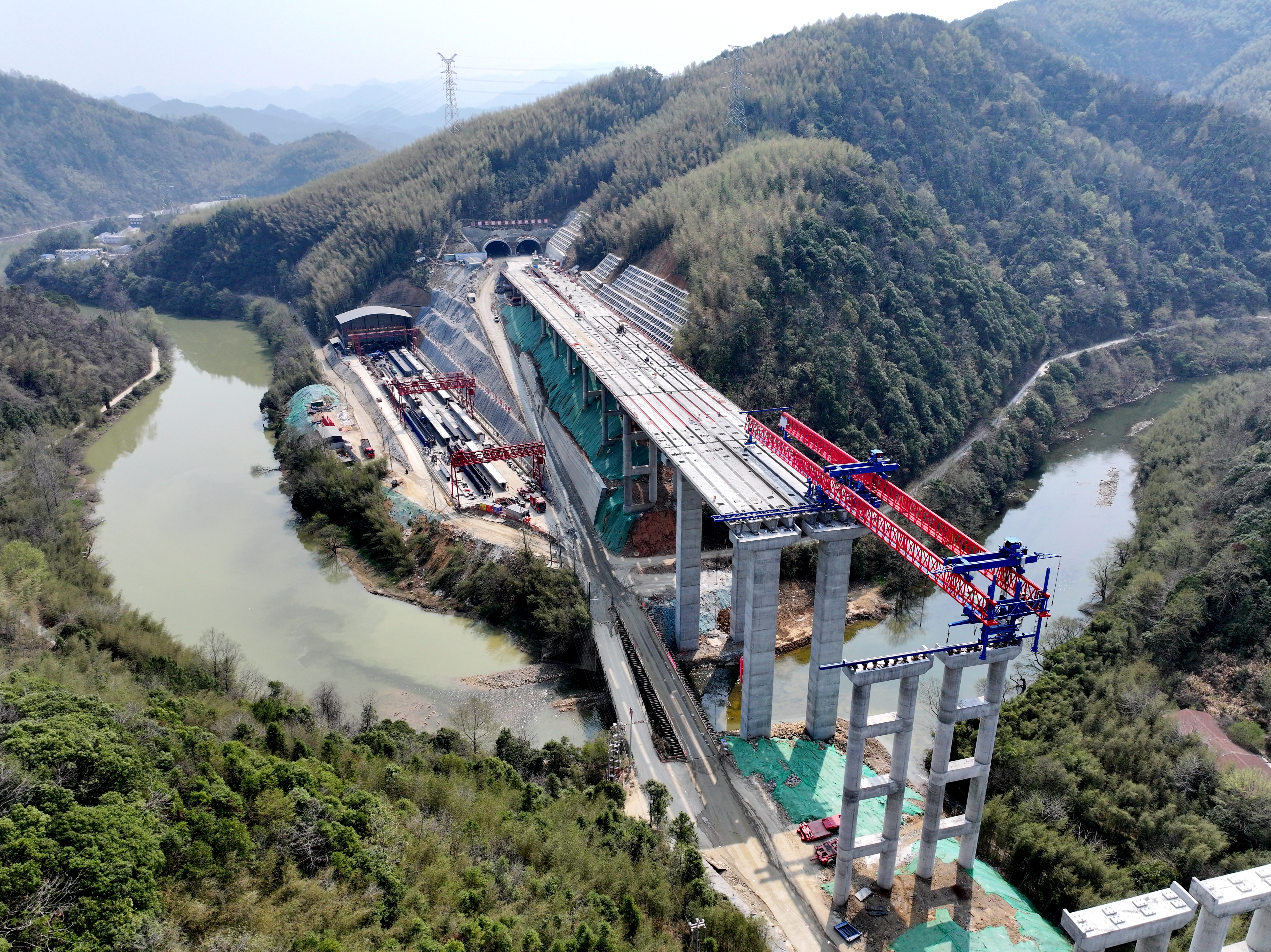 在橋梁施工方面,橫跨浣溪河的特大橋建設同樣面臨挑戰(zhàn)。為克服12%運梁坡度帶來的困難,項目創(chuàng)新采用“雙主機雙制動運梁炮車”技術,經過多次模擬推演,成功實現(xiàn)首片40米箱梁精準架設。這一突破,標志著項目施工從下部結構向上部結構轉換,實現(xiàn)橋梁與隧道工序無縫銜接,為后續(xù)架梁作業(yè)奠定基礎。截至目前,項目路基填筑已完成98%,橋梁樁基工程全部完工,梁板預制架設進度突破55%。