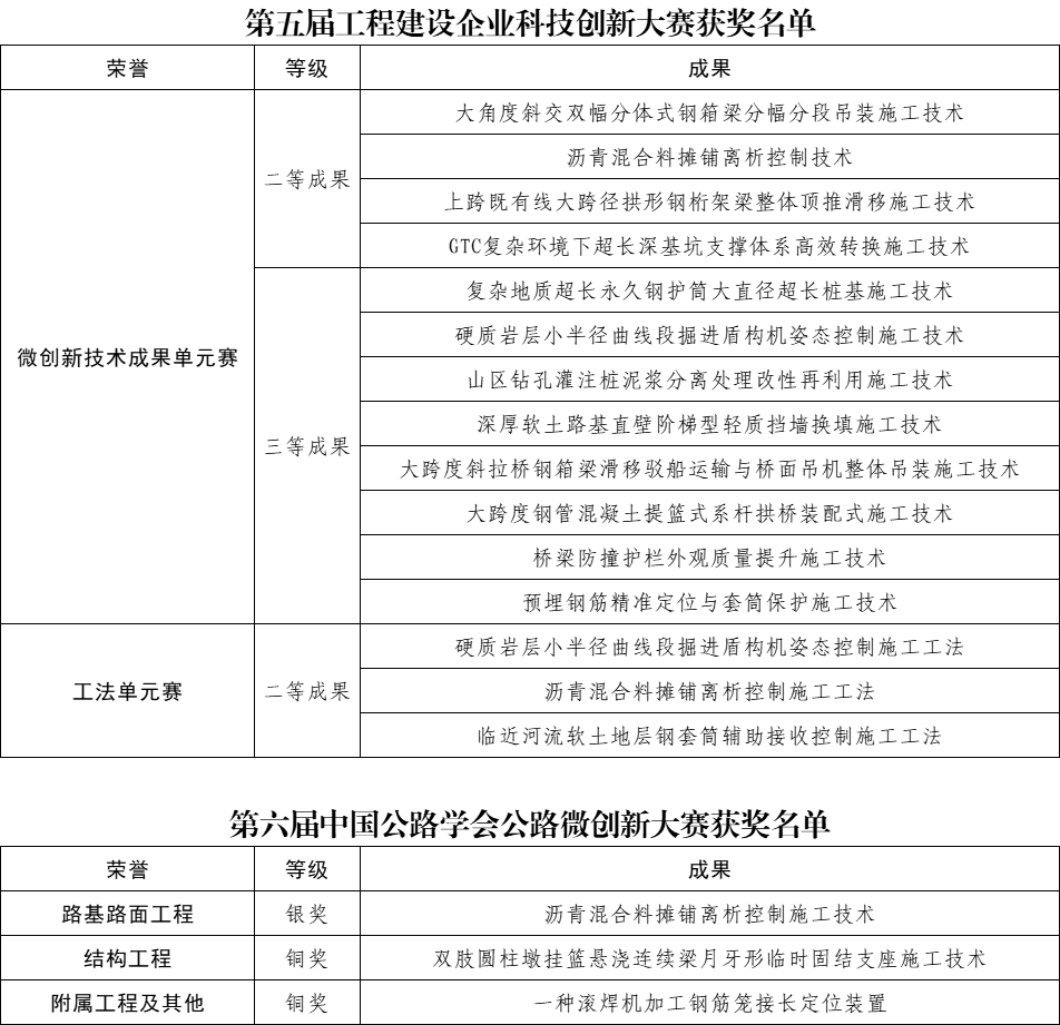 近日,中國(guó)公路學(xué)會(huì)與中國(guó)施工企業(yè)管理協(xié)會(huì)相繼公布了第六屆公路微創(chuàng)新大賽和第五屆工程建設(shè)企業(yè)科技創(chuàng)新大賽評(píng)選結(jié)果。公司在兩項(xiàng)國(guó)家級(jí)賽事中共獲18項(xiàng)獎(jiǎng)項(xiàng),其中,在微創(chuàng)新大賽中摘得銀獎(jiǎng)1項(xiàng)、銅獎(jiǎng)2項(xiàng),在科技創(chuàng)新大賽中榮獲二等成果7項(xiàng)、三等成果8項(xiàng)。
