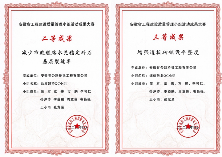 創(chuàng)新課題“積微成著”。憑借不同環(huán)境下的路基路面施工實(shí)踐,項(xiàng)目團(tuán)隊(duì)持續(xù)開展技術(shù)攻堅(jiān)和經(jīng)驗(yàn)萃取。在路面基層施工階段,通過嚴(yán)格控制石粉含泥量,成功避免水穩(wěn)碎石基層裂縫,基層壓實(shí)度全面控制在96%以上;在附屬結(jié)構(gòu)施工中,項(xiàng)目團(tuán)隊(duì)對人行道板磚使用及鋪設(shè)進(jìn)行改良,提升了路面觀感和行走舒適度。這些源于項(xiàng)目一線的創(chuàng)新案例,不僅提升了項(xiàng)目的建設(shè)質(zhì)量和效率,更為后續(xù)的項(xiàng)目建設(shè)提供了寶貴的經(jīng)驗(yàn)借鑒。相關(guān)QC成果在安徽省建設(shè)質(zhì)量管理小組成果大賽中分別獲得二等獎和三等獎。