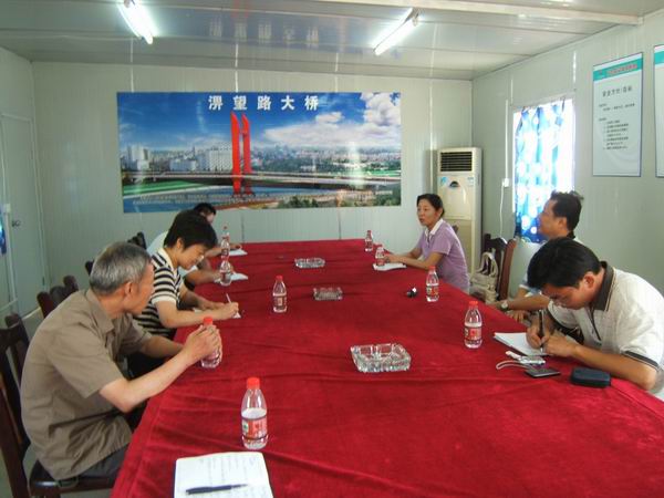 在項目部會議室,李主席等領(lǐng)導仔細聽取項目經(jīng)理江仲明的介紹,不時關(guān)切地詢問工程相關(guān)情況。工會主席趙其榮向集團工會李主席等一行在高溫天氣下來公司淠望路大橋項目部慰問表示感謝。