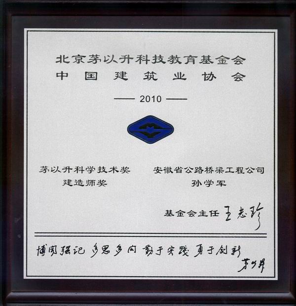 孫學(xué)軍主持建設(shè)了安徽省南照淮河大橋、沿江高速、廬銅高速、銅湯高速、合肥市徽州大道等工程項(xiàng)目,所建項(xiàng)目榮獲了國家優(yōu)質(zhì)獎“魯班獎”、省優(yōu)“黃山杯”等獎項(xiàng),并獲省交通廳“優(yōu)秀施工單位”、合肥市委市政府“大建設(shè)先進(jìn)集體”等榮譽(yù)。此外,他個(gè)人榮獲全國優(yōu)秀建造師、“魯班獎”工程優(yōu)秀項(xiàng)目經(jīng)理、“黃山杯”工程優(yōu)秀項(xiàng)目經(jīng)理等榮譽(yù)。