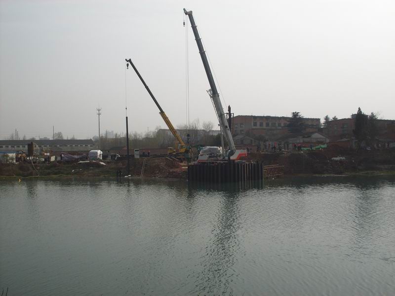 淠望路大橋作為市政工程具有工期緊、任務(wù)重、技術(shù)難度大的特點,但經(jīng)項目部領(lǐng)導(dǎo)精心組織、科學(xué)部署,加大人力與設(shè)備的投入,自2月1日進場開工以來,全部90根挖孔樁已開挖41根,累計深度270m;于2月18日開始進行關(guān)鍵工序——主墩右幅鋼板樁圍堰施工。由于淠史杭干渠承擔(dān)皖豫兩省14個縣(區(qū))的春耕灌溉任務(wù),六安市重點辦要求加快施工進度,必須在4月15日完成所有水下工程及用于水面以上施工的支撐等,并于4月25日前完成圍堰拆除清理工作。項目部立即召開緊急動員會,號召全體技術(shù)人員克服一切困難和挑戰(zhàn),堅決完成上級交代的任務(wù),并立即組織技術(shù)人員根據(jù)鋼板樁長度、水深、地質(zhì)、承臺埋置深度等情況,制定了科學(xué)的施工技術(shù)方案、成立了以項目部經(jīng)理、副經(jīng)理為組長的安全領(lǐng)導(dǎo)小組。施工所用的T90振動錘、70t吊車、25t吊車、PC200挖機、 T100推土機、ZLM50裝載機、自卸車等重型機械設(shè)備陸續(xù)開進施工現(xiàn)場。